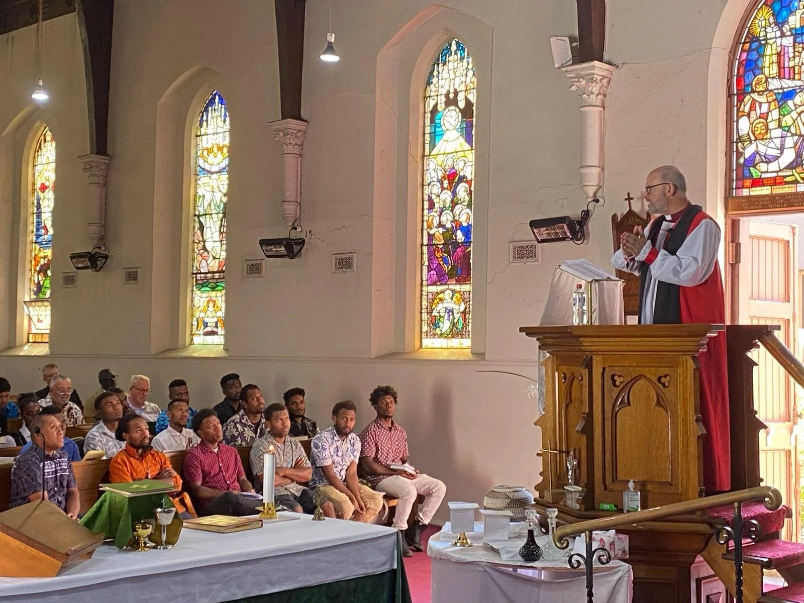 The service, faithfully following the second order Eucharistic liturgy from A Prayer Book for Australia, was energised with music and dance from the Dinka congregation and the Solomon Singers. The Singers, a group of Solomon Island men who are regular worshippers at St John’s, all of whom work at the Cedar Meats Abattoir in Brooklyn, led the singing of the Gloria, the Nicene Creed, the Lord’s Prayer and more. The Dinka Youth and the Sunday school children also contributed musical offerings. To complete the mix, there were two traditional hymns – ‘Praise to the Lord, the Almighty, the King of creation’ and ‘Guide me O thou Great Jehovah’ – and some organ music during Communion.