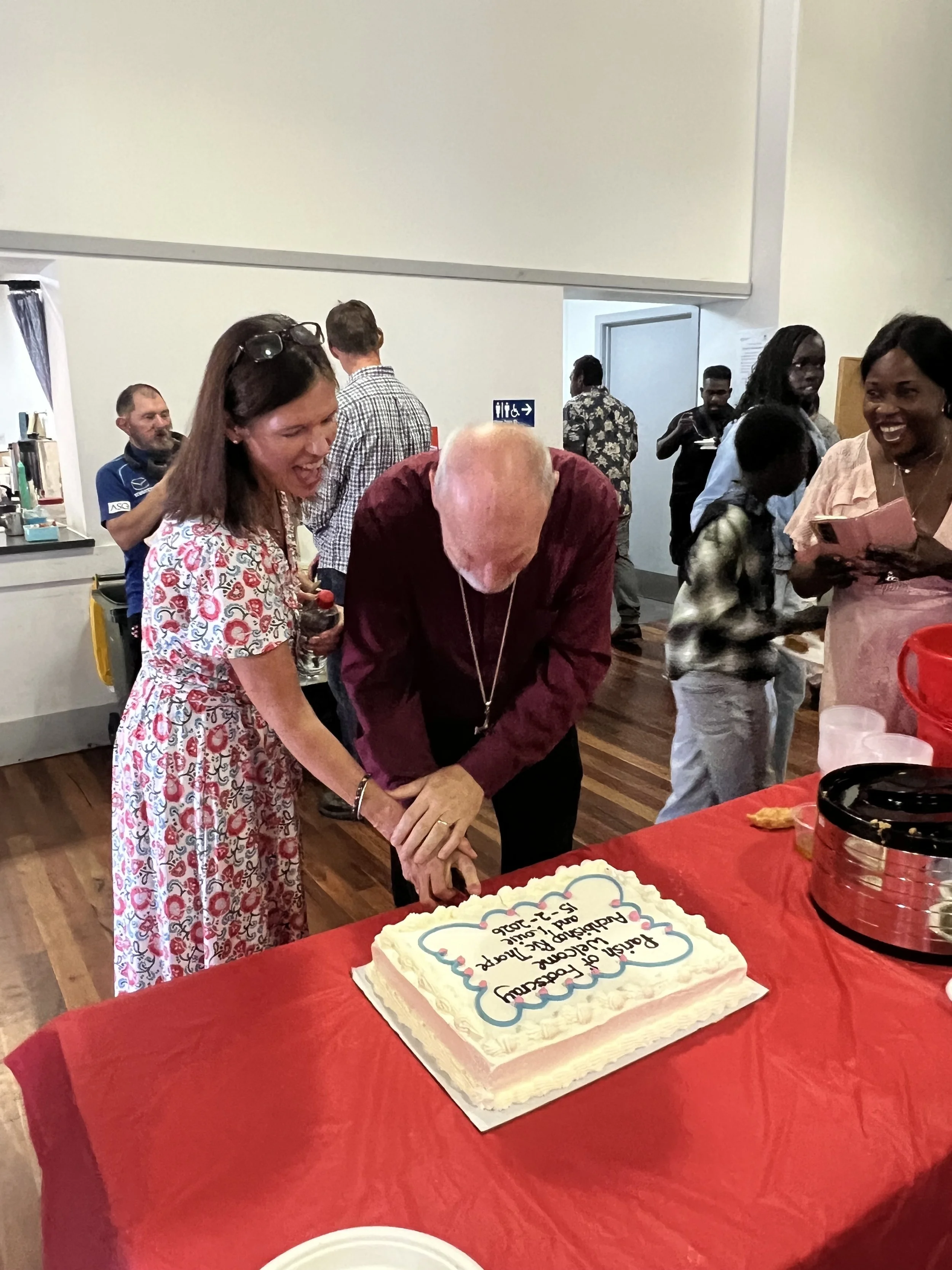 The service was followed by a community lunch, attended by Archbishop Thorpe and Mrs Louie Thorpe, where Dr and Mrs Thorpe cut the special cake made to celebrate the Archbishop’s visit. The Vicar, Canon Nigel Pope, said the archbishop could hardly eat his meal because so many people lined up to pray with him and ask for a blessing during lunch!